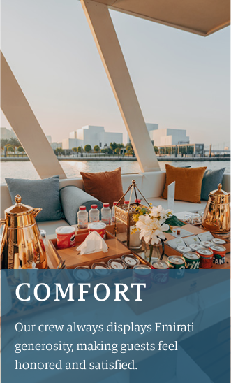 The Dubai Floating Café is a symbol of generosity – Gahwa – which stands for Arabic coffee. Enjoy the warmth and hospitality of the Emiratis on daily marine tours across the heart of Dubai. Going on an unforgettable adventure of a lifetime with Dreams Boats Dubai.